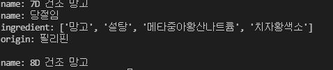 "ingredient": ["망고", "설탕", "메타중아황산나트륨", "치자황색소"],