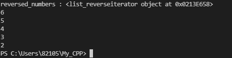 -> 리스트에 reversed() 함수를 사용할 때 <list_reverseiterator object at (주소)> 처럼 출력했듯 reversed() 함수의 리턴값이 'reverseiterator'로 '이터레이터'이다. 이와 같은 이터레이터는 반복문의 매개변수로 전달할 수 있으며 현재 코드처럼 next()함수로 내부의 요소를 하나하나 꺼낼 수 있다.