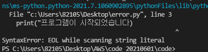 구문 오류 : SyntaxError, 구문에 문제가 있어 프로그램이 실행조차 되지 않는 오류. 해결을 위해 코드를 제대로 수정해야 함