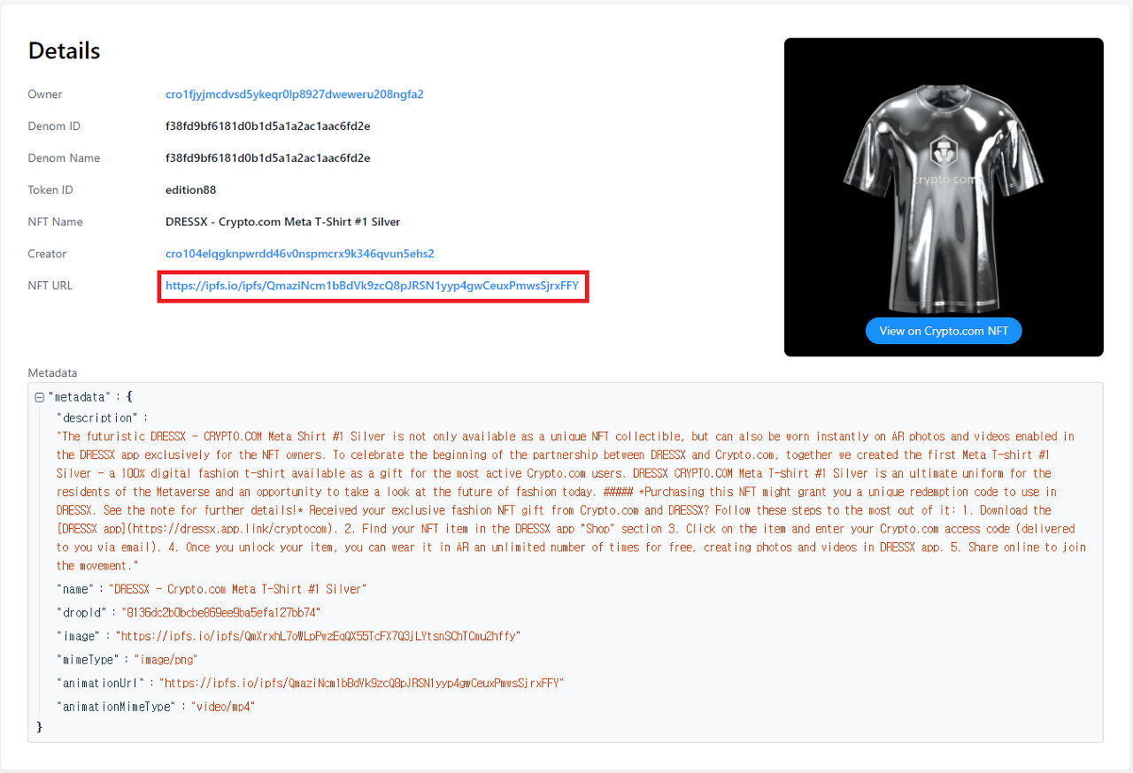 위와 같이 NFT URL 값이 노출되었고 해당 URL을 입력하면 누구나 NFT 자산에 쉽게 접근할 수 있다.