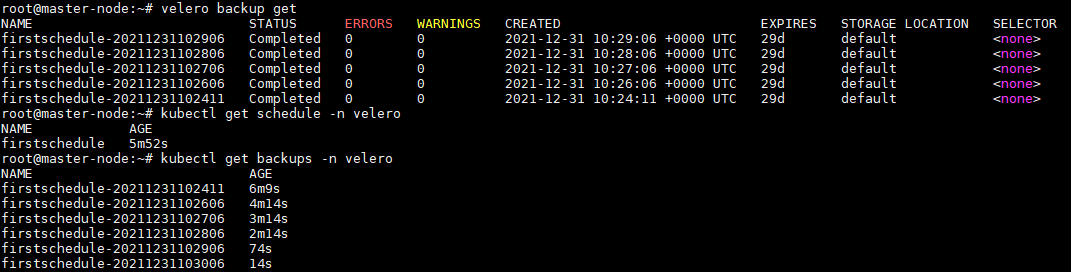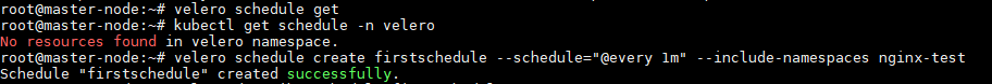velero schedule create firstschedule --schedule="@every 1m" --include-namespaces nginx-test