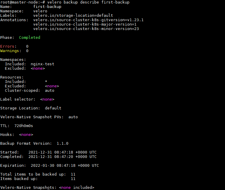 velero backup create second-backup --include-namespaces nginx-test --ttl 2h