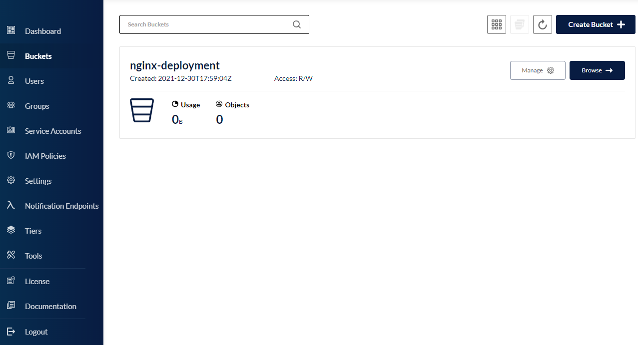 minIO 콘솔 접속 후, 버킷 생성 - nginx-deployment