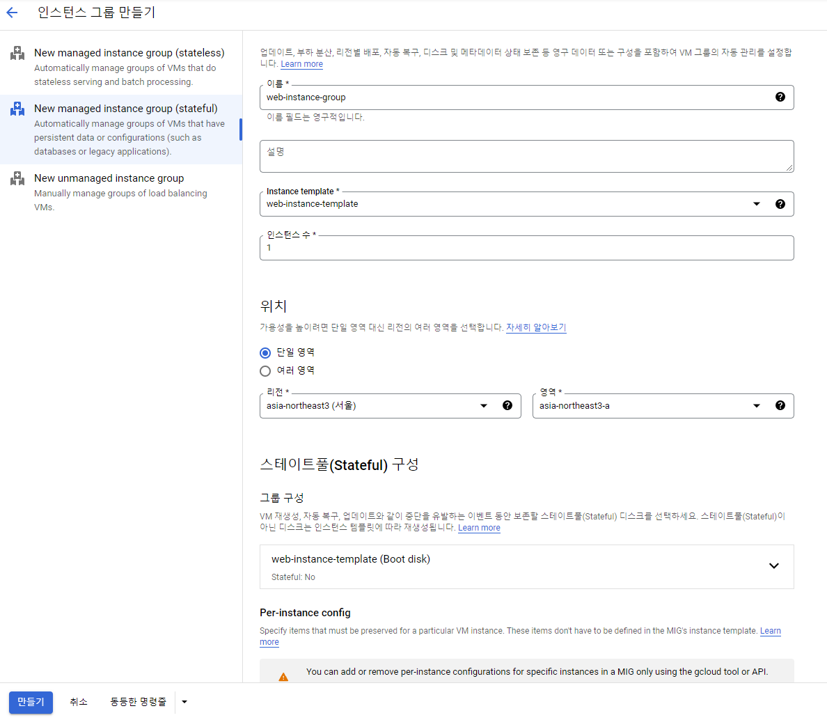 해당 예제에서는 인스턴스 그룹(MIG) 생성 시, DB 연결을 위해 stateful 방식을 적용했다.
