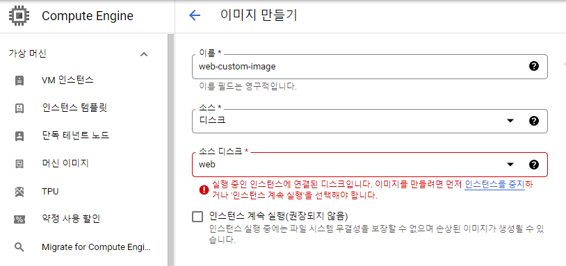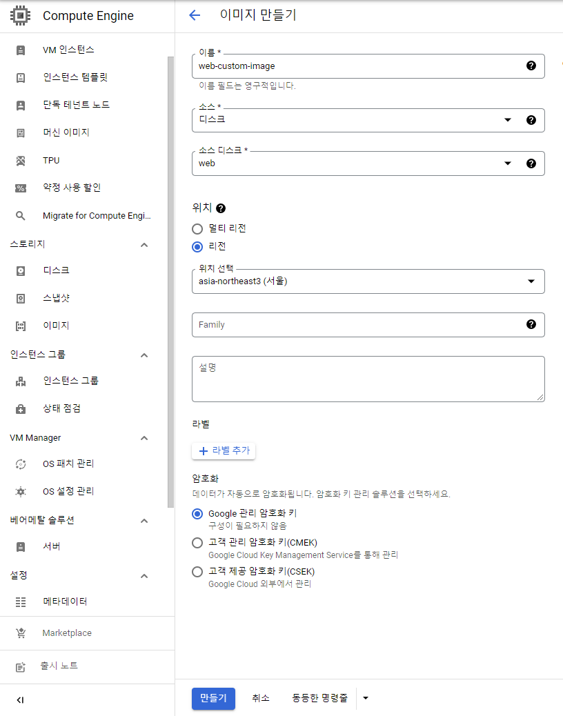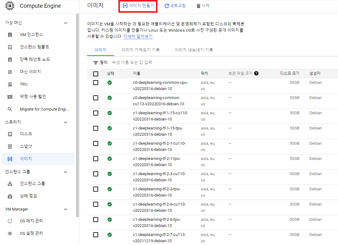 - 소스 디스크, 이미지, 스냅샷 또는 Cloud Storage에 저장된 이미지에서 custom image를 만들고 이 이미지를 사용하여 가상 머신(VM) 인스턴스를 만들 수 있다.