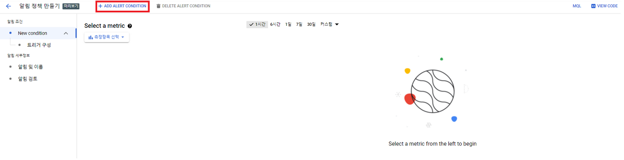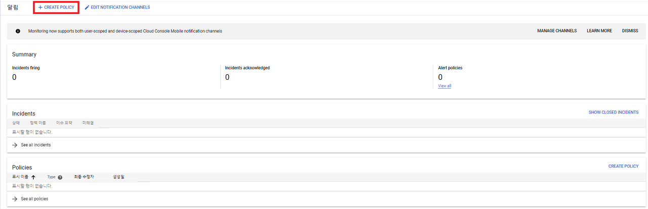 - 구성 : Console > Monitoring > Alerting > CREATE POLICY