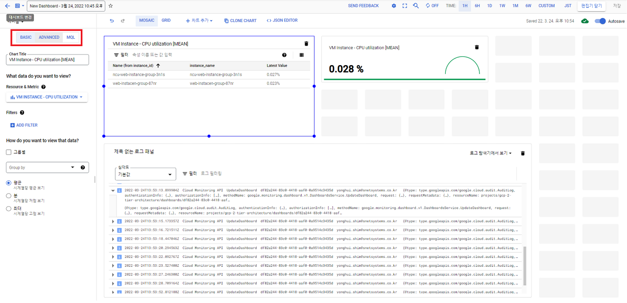 경로 : GCP Console > Monitoring > Dashboards > CREATE DASHBOARD