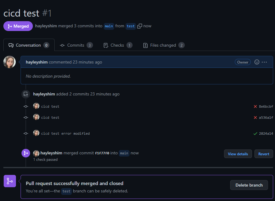 main 브랜치에서 test 브랜치를 만든 뒤, 앱 서비스의 코드 일부를 수정한 후 test 브랜치에서 push 한다.