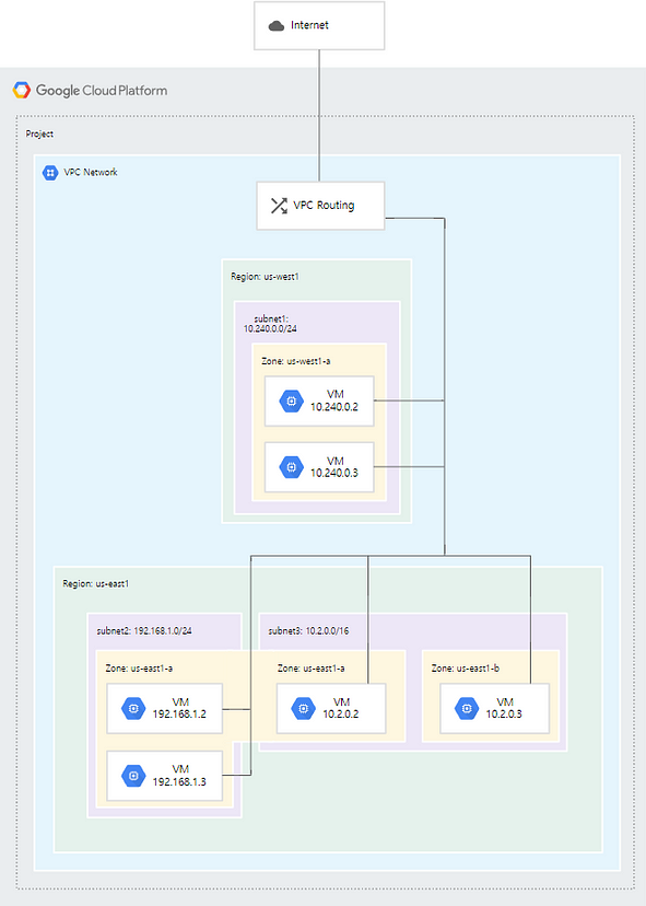- 각 region에 기본 VPC가 있는 AWS와 달리 GCP는 하나의 VPC 내에 region이 있습니다.