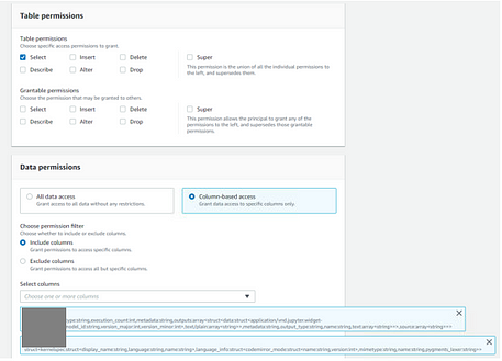 Step 3. 보안 관리 : 데이터베이스, 테이블, 열, 행 및 셀 수준에서 데이터에 대한 액세스를 제한하는 보안 정책을 정의. 이러한 정책은 IAM 사용자 및 역할에 적용되며, 외부 자격 증명 공급자를 통해 연합할 때 사용자 및 그룹에 적용. 세분화된 제어를 사용하여 Amazon Redshift Spectrum, Athena, AWS Glue ETL 및 Amazon EMR for Apache Spark 내에서 Lake Formation으로 보호되는 데이터에 액세스할 수 있음