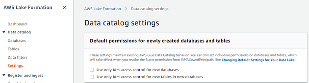 Lake Formation은 기존 AWS Glue 데이터 카탈로그 동작과의 호환성을 위해 활성화된 “IAM 액세스 제어만 사용” 설정으로 시작합니다. Lake Formation 권한으로 세분화된 태그 기반 액세스 제어를 활성화하려면 이러한 설정을 비활성화하는 것이 좋습니다.