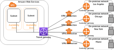 - VPC에는 전송 게이트웨이가 연결되어 있고, 여러 온프레미스 위치에 여러 Site-to-Site VPN 연결이 있습니다. 네트워크로 바인딩되는 VPC의 모든 트래픽이 전송 게이트웨이로 라우팅되도록 라우팅을 설정합니다.