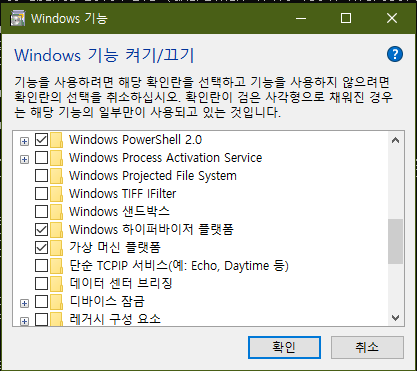 window 설치 경우, wsl 설치 전 Linux용 Windows 하위 시스템, Windows 하이퍼바이저 플랫폼, 가상 머신 플랫폼을 선택해줍니다.(Mac 설치 권장)