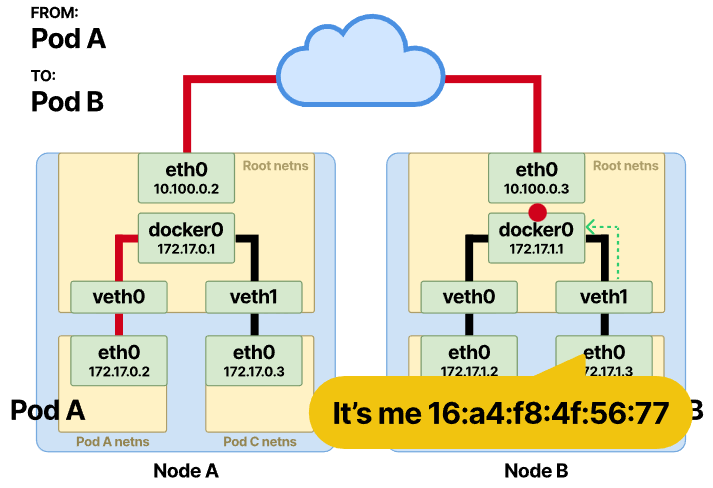 Pod-B를 연결하는 인터페이스의 MAC 주소로 응답을 받습니다.