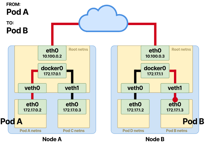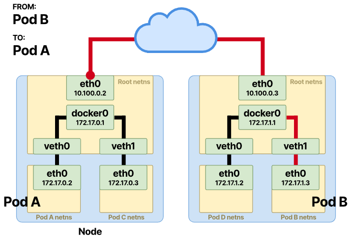 동일한 노드에 두 개의 Pod가 있고 Pod-A가 Pod-B에 메시지를 보내려고 한다고 가정해 보겠습니다.