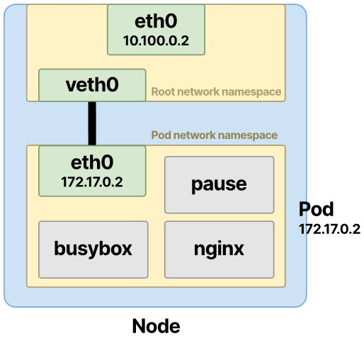 Pod의 다른 모든 컨테이너는 이 컨테이너에서 생성한 기존 network namespace에 join합니다.