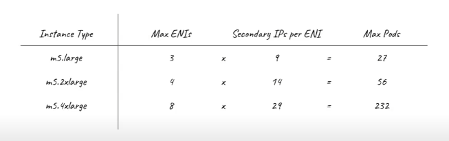 - 워커 노드의 인스턴스 타입 별 파드 생성 갯수가 제한됩니다. 인스턴스 타입 별 ENI 최대 갯수와 할당 가능한 최대 IP 갯수에 따라서 파드 배치 갯수가 결정됩니다. 단, aws-node 와 kube-proxy 파드는 호스트의 IP를 사용함으로 최대 갯수에서 제외합니다.