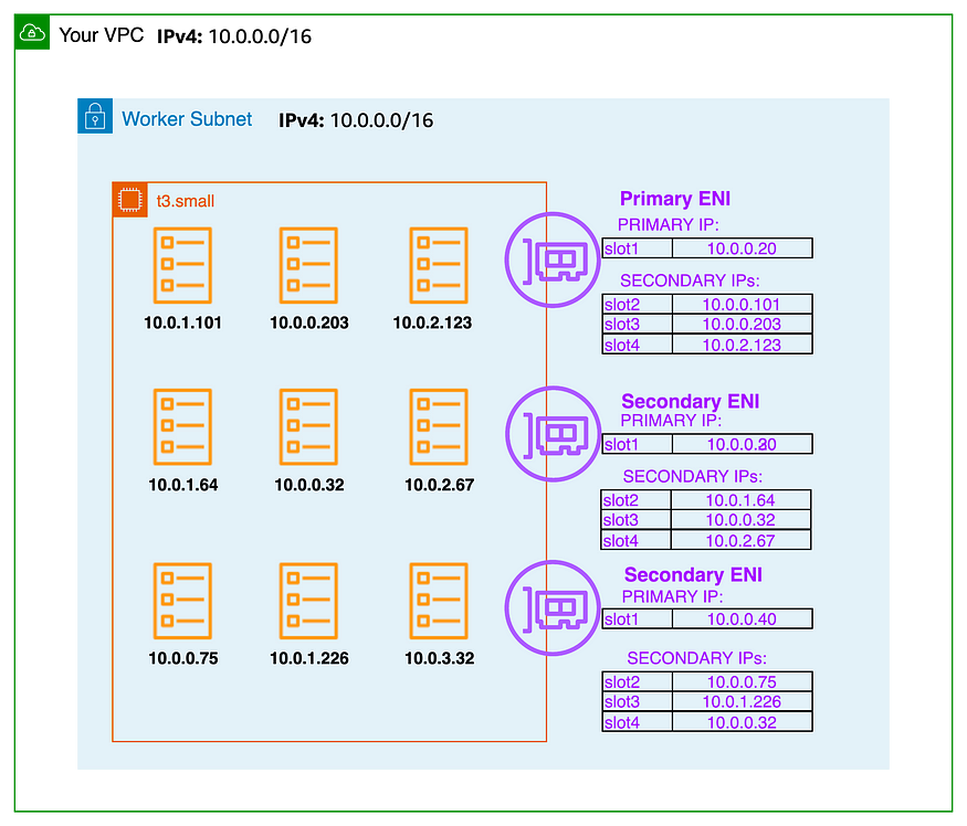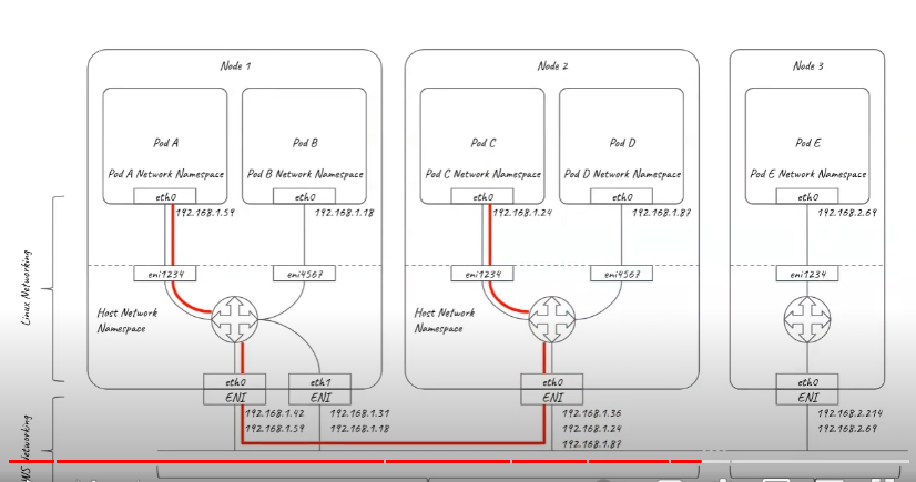 - 각 pod 들은 underlying VPC 서브넷의 IP 주소를 할당받고 pod ip는 instance의 ENI 상의 secondary IP로 설정됩니다. 노드 상의 pod의 수가 ENI에서 지원되는 secondary IP의 수를 초과하게된다면 ENI가 자동으로 node에 추가 할당됩니다.
