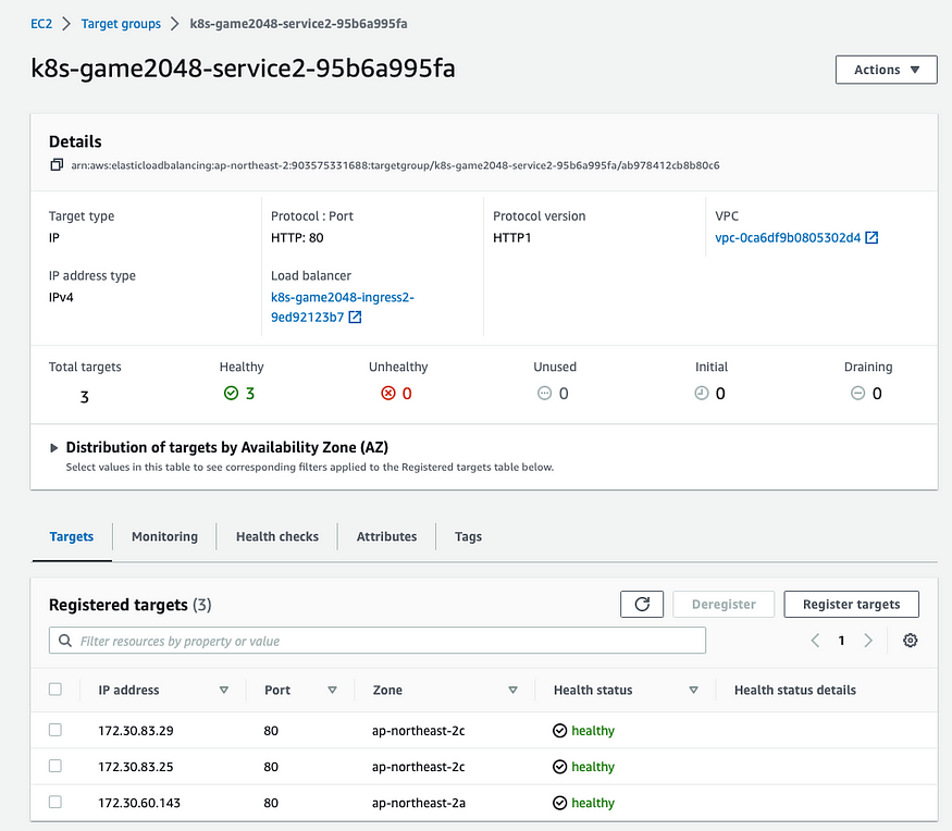 아래와 같이 ALB 대상 그룹에 등록된 대상 확인합니다.