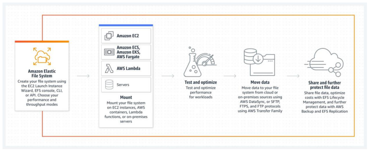 - AWS EFS : AWS에서 제공하는 File Storage 서비스로 표준 파일 시스템(NFS v4.0, v4.1), 수천 개의 인스턴스 간 공유 가능, 페타바이트 규모 확장가능, 사용하는 용량에 따른 자동 성능 확장 등 제공