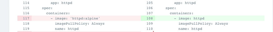 위와 같이 깃 저장소의 소스 이미지 버전(httpd)과 현재 클러스터의 실행 상태의 이미지 버전(httpd:alpine)이 서로 다릅니다. 이때 ArgoCD의 동작은 어떤지 보겠습니다.