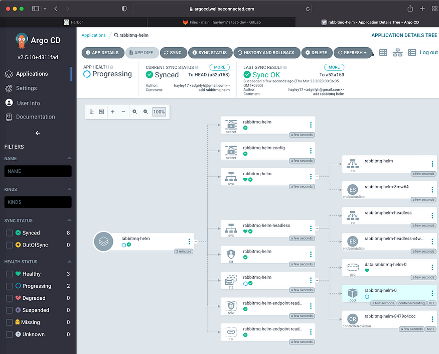다시 SYNC를 맞추면 ArgoCD 가 자동으로 깃 저장소의 YAML파일 기준으로 쿠버네티스 오브젝트를 동기화합니다.