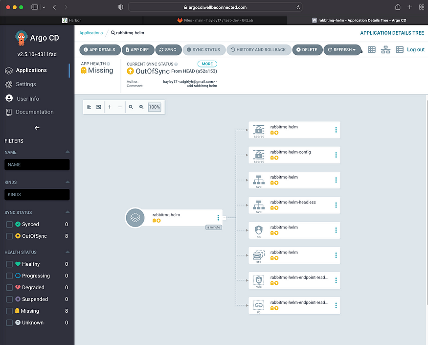 관리자 페이지에서 아래와 같이 서비스 오브젝트 상태가 Missing 으로 변경되었습니다. 임의로 클러스터의 상태를 변경하면 ArgoCD의 argocd-application-controller 파드가 웹훅 방식으로 감지해서 자동으로 쿠버네티스 리소스의 변경 사항을 관리자 화면에 나타냅니다.