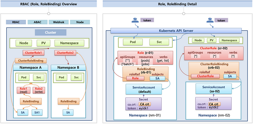 - Role(롤) — (RoleBinding 롤 바인딩) — Service Account(서비스 어카운트) : 롤 바인딩은 롤과 서비스 어카운트를 연결