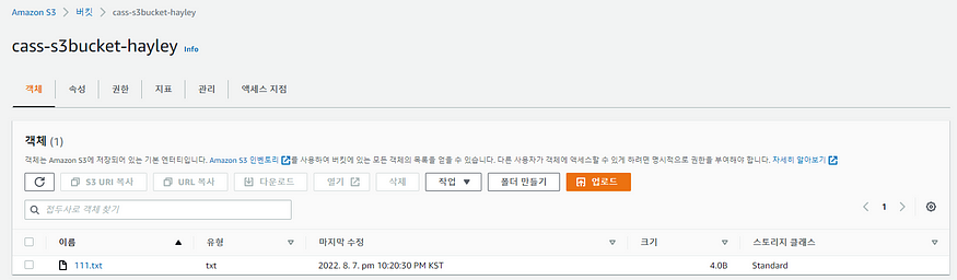 aws s3 mb s3://cass-s3bucket-$S3suffix --region ap-northeast-2# 텍스트 파일 생성 후 을 S3로 업로드