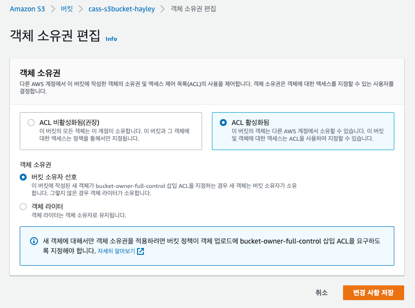 2. S3 > 권한 > 객체 소유권 편집 > ACL 활성화를 선택하고 아래 정책 적용