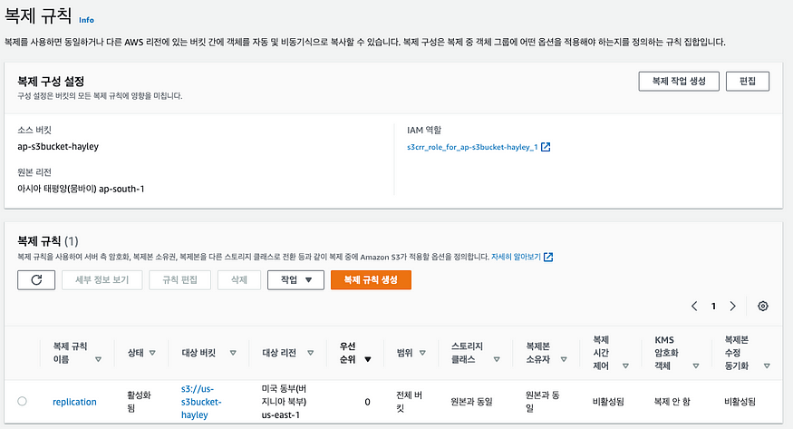 - Source Bucket > 관리 > 복제규칙 생성 클릭