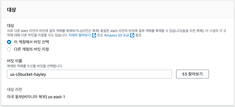 3. 대상 > 버킷 이름 > 옮길 대상 버킷 설정(US 리전 버킷 선택)
