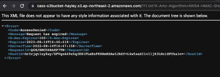 aws s3 presign s3://cass-s3bucket-hayley/111.txt --expires-in 100 --profile awssecadminhttps://cass-s3bucket-hayley.s3.ap-northeast-2.amazonaws.com/111.txt?X-Amz-Algorithm=AWS4-HMAC-SHA256&X-Amz-Credential=AKIA5EYKJMNUASA5J7U6%2F20220814%2Fap-northeast-2%2Fs3%2Faws4_request&X-Amz-Date=20220814T164501Z&X-Amz-Expires=100&X-Amz-SignedHeaders=host&X-Amz-Signature=c9404d5cf8844fcdd18041f9e71973b829c2b5a1fe06584fb76e3d9fdadb4afb# 실습