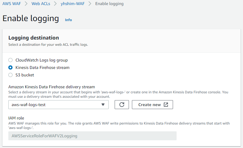 AWS WAF는 Amazon Kinesis Firehose를 사용하여 로그를 저장합니다. 웹 ACL에서 요청을 로깅하려면 먼저 Kinesis Data Firehose를 생성해야 하는데, 해당 실습에서는 이미 모듈 1. 에서 CloudFormation 스택을 통해 Kinesis Firehose와 최종 대상인 S3 bucket을 생성했습니다.