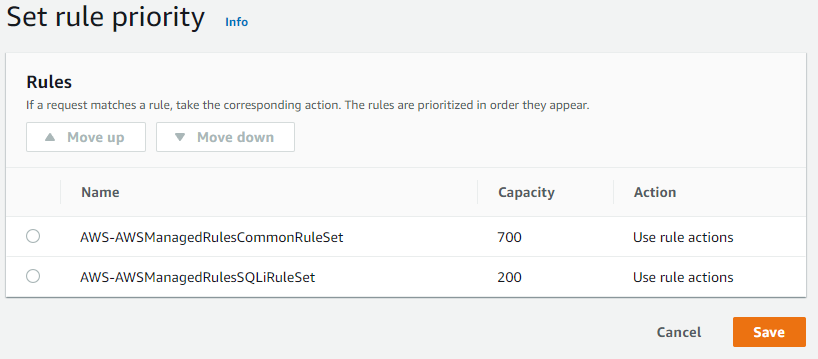 - Core rule set 과 SQL database 에 대해 “Add to web ACL”을 클릭하고 하단의 “Add rules”를 클릭합니다.