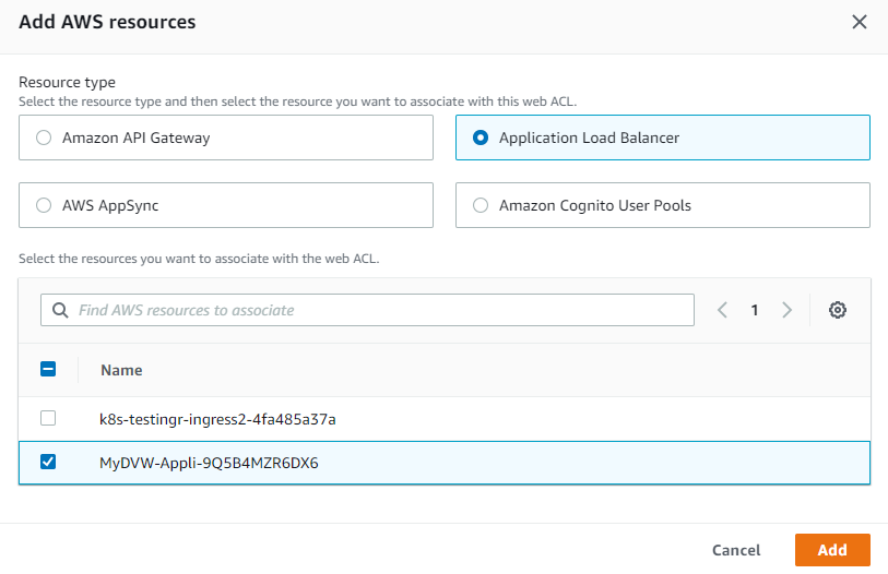 3. 생성되는 WebACL 에 리소스를 할당하기 위하여 “Add AWS Resources” 버튼을 클릭합니다. “Add AWS Resources” 화면에서 이전 과정에서 생성되었던 ALB 를 선택한 후 “Add” 버튼을 클릭합니다.