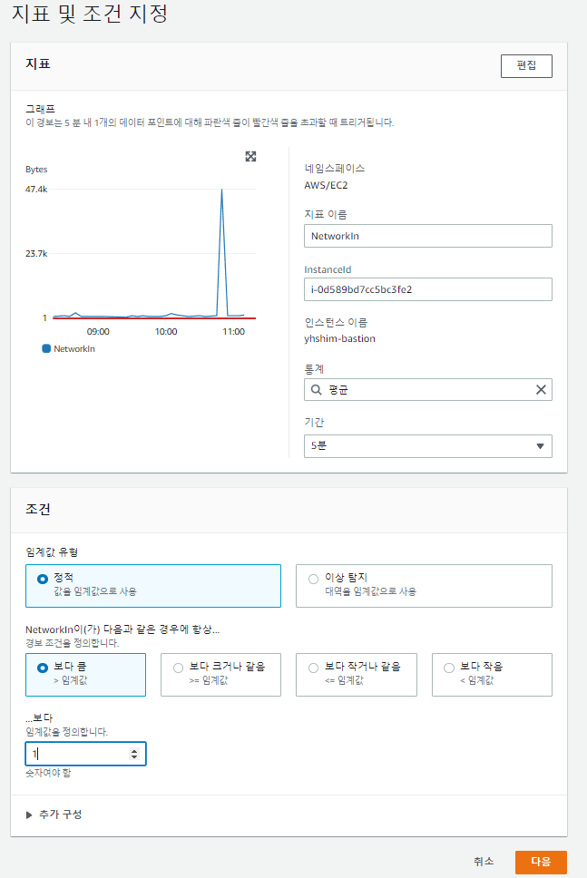 CloudWatch → [왼쪽] 경보 → [오른쪽]경보생성 → 지표선택→ EC2 → 인스턴스별 지표 → 지표 및 조건 선택 → 다음