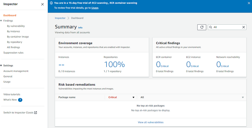 Amazon Inspector는 소프트웨어 취약성 및 의도하지 않은 네트워크 노출에 대해 AWS 워크로드를 지속적으로 스캔하는 자동화된 취약성 관리 서비스입니다.