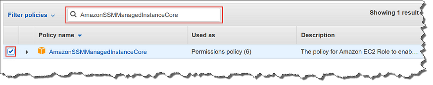 - 검색(Search) 필드를 사용하여 AmazonSSMManagedInstanceCore 정책을 찾습니다. 이름 옆의 확인란을 선택합니다.