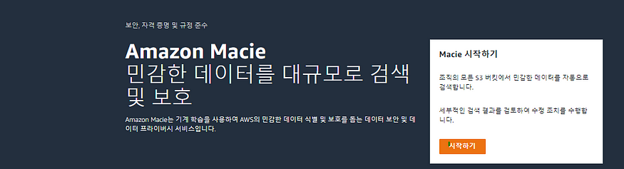 Amazon Macie는 완전관리형 데이터 보안 및 데이터 프라이버시 서비스로서, 기계 학습 및 패턴 일치를 활용하여 AWS에서 민감한 데이터를 검색하고 보호합니다.