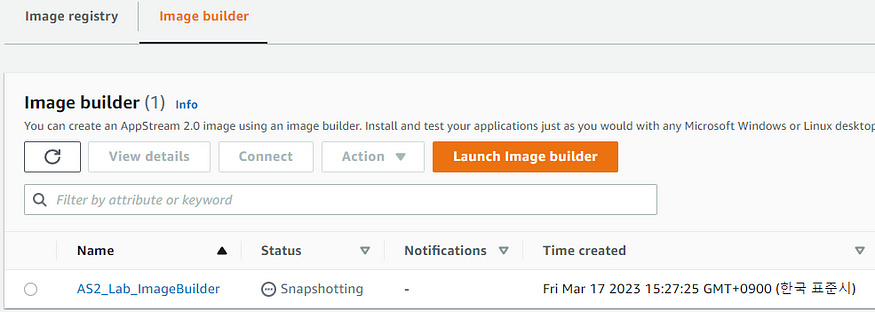 탐색 창에서 이미지를 선택한 다음 이미지 빌더 탭을 선택합니다. 이 과정에서 이미지 빌더는 생성되는 동안 스냅샷 상태를 표시합니다 .