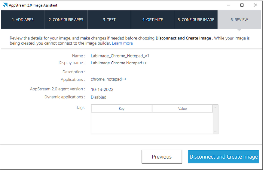 이제 개별 애플리케이션이 설치되고 구성된 이미지 빌더 인스턴스가 있습니다. Image Assistant가 스트리밍 성능을 위해 애플리케이션을 최적화하고, 스트리밍 인스턴스가 시작될 사용자 지정 이미지를 생성해야 합니다.
