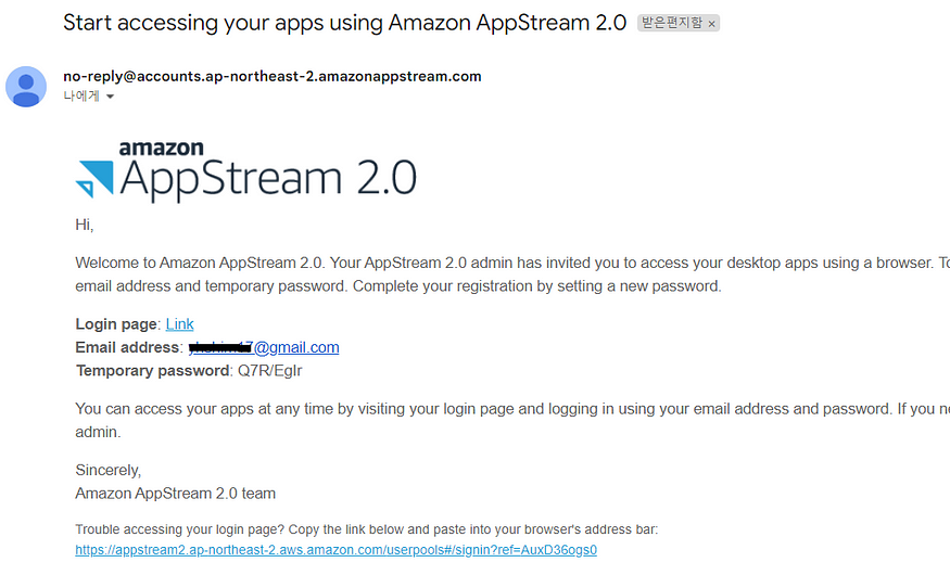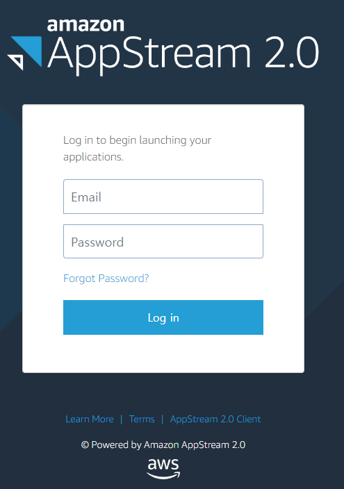 AppStream 2.0은 각 작업 후 이메일 주소로 이메일을 보냈습니다. 최종 사용자 경험을 테스트하려면 생성한 사용자로 AppStream 2.0에 로그인하고 스트리밍 세션을 시작할 수 있습니다.
