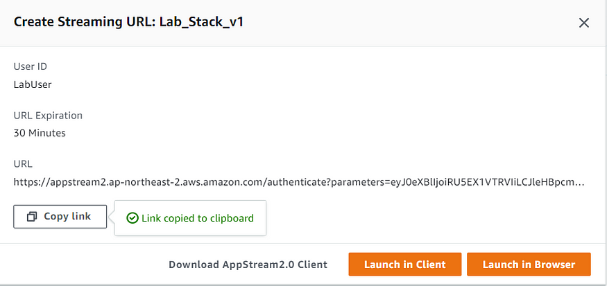 스택을 정의했으며 최종 사용자가 액세스할 수 있는 스트리밍 환경이 준비되었습니다. 각 사용자는 환경을 가리키는 활성 URL이 필요합니다. 이를 스트리밍 URL이라고 합니다.