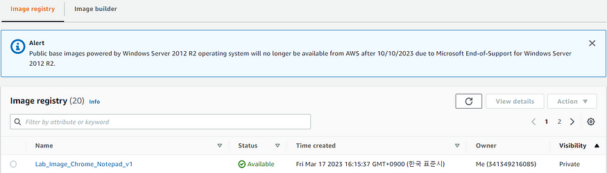 이미지 레지스트리 탭을 선택합니다 . 속성 또는 키워드로 필터링 상자에서 Visibility=Private 를 선택합니다 . 스냅샷이 완료되면 이미지가 사용 가능 상태로 나타납니다 .