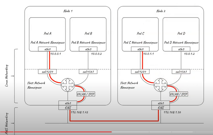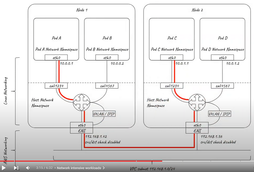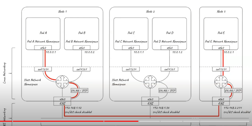 - Calico CNI는 host networking namespace에 설치되고 각각의 노드는 virtual router로 역할을 합니다. AWS 네트워크 경우 ENI IP 주소만 알고 pod가 어디에 있는지 모릅니다. 기존 방식에서는 오버레이 네트워크를 통해 이를 해결하는데 Calico 경우 VXLAN, IP-IP 통신을 지원합니다.