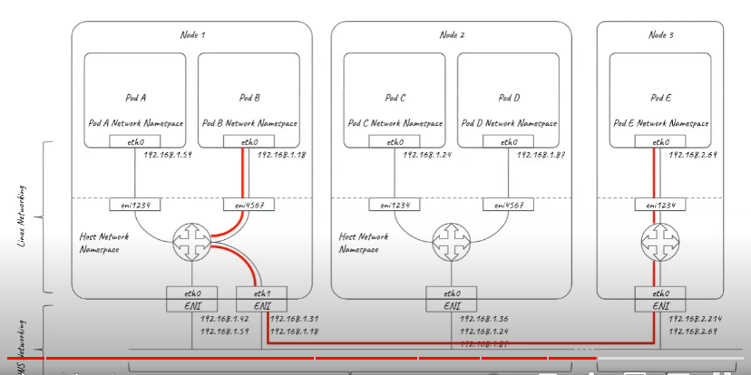 - 각 pod 들은 underlaying VPC 서브넷의 IP 주소를 할당받고 pod ip는 instance의 ENI 상의 secondary IP로 설정됩니다. 노드 상의 pod의 수가 ENI에서 지원되는 secondary IP의 수를 초과하게된다면 ENI가 자동으로 node에 추가 할당됩니다.