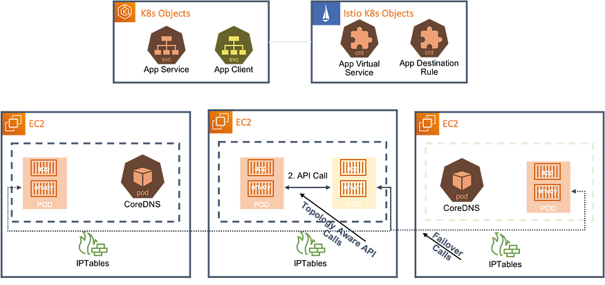 - 데모에서 볼 수 있듯이 Istio를 활성화하고 앱 서비스를 대상으로 하는 대상 규칙을 배포하면 토폴로지 인식 라우팅이 활성화되고 상당한 교차 AZ 비용을 피할 수 있습니다. 또한 Istio는 동일한 가용 영역에서 실행 중인 포드를 사용할 수 없는 경우 다른 가용 영역에서 실행 중인 포드로 장애 조치하여 다음 다이어그램과 같이 고가용성을 보장합니다.