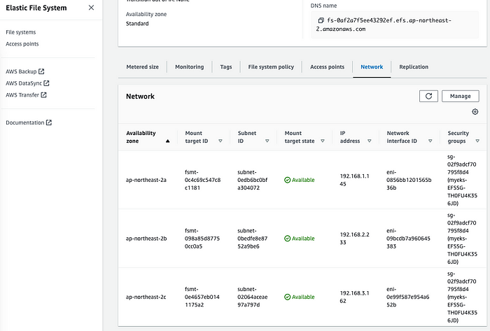 fs-0af2a7f5ee43292ef.efs.ap-northeast-2.amazonaws.com:/ on /mnt/myefs type nfs4 (rw,relatime,vers=4.1,rsize=1048576,wsize=1048576,namlen=255,hard,noresvport,proto=tcp,timeo=600,retrans=2,sec=sys,clientaddr=192.168.1.100,local_lock=none,addr=192.168.1.145)
