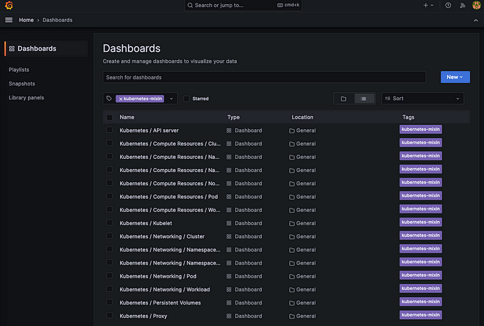 - 스택을 통해서 설치된 기본 대시보드 확인 : Dashboards → Browse
